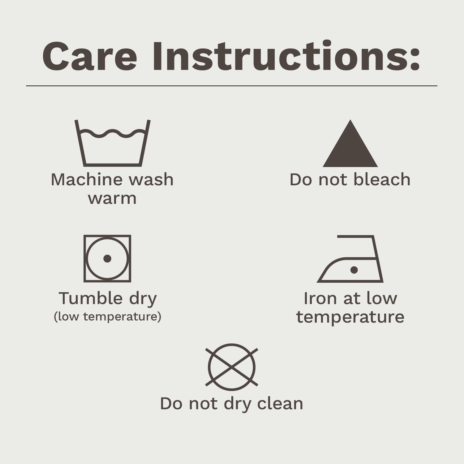 • Machine wash warm, no bleach, tumble dry low, low heat iron, do not dry clean.